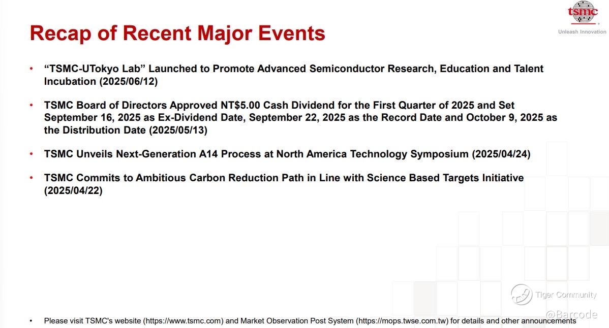 Despite structural dilution from overseas fab expansion in the US, Germany, and Japan, TSMC reiterated its long-term gross margin target of β₯53%. The FX headwinds were real, but better cost absorption and utilization offset that. Improved A/R and inventory days reflect stronger operational execution, even with increased 3nm/5nm volume.
