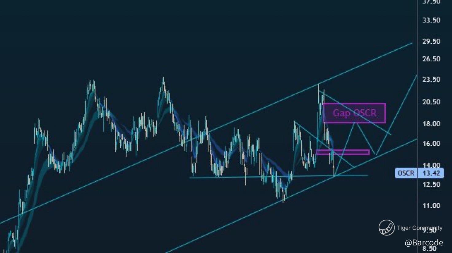 The $OSCR chart presents a compelling asymmetric setup that complements the high-momentum $OPEN thesis. At $13.42, Oscar Health is riding along a clean uptrend channel with multiple bullish technical signals aligning with structural fundamentals.