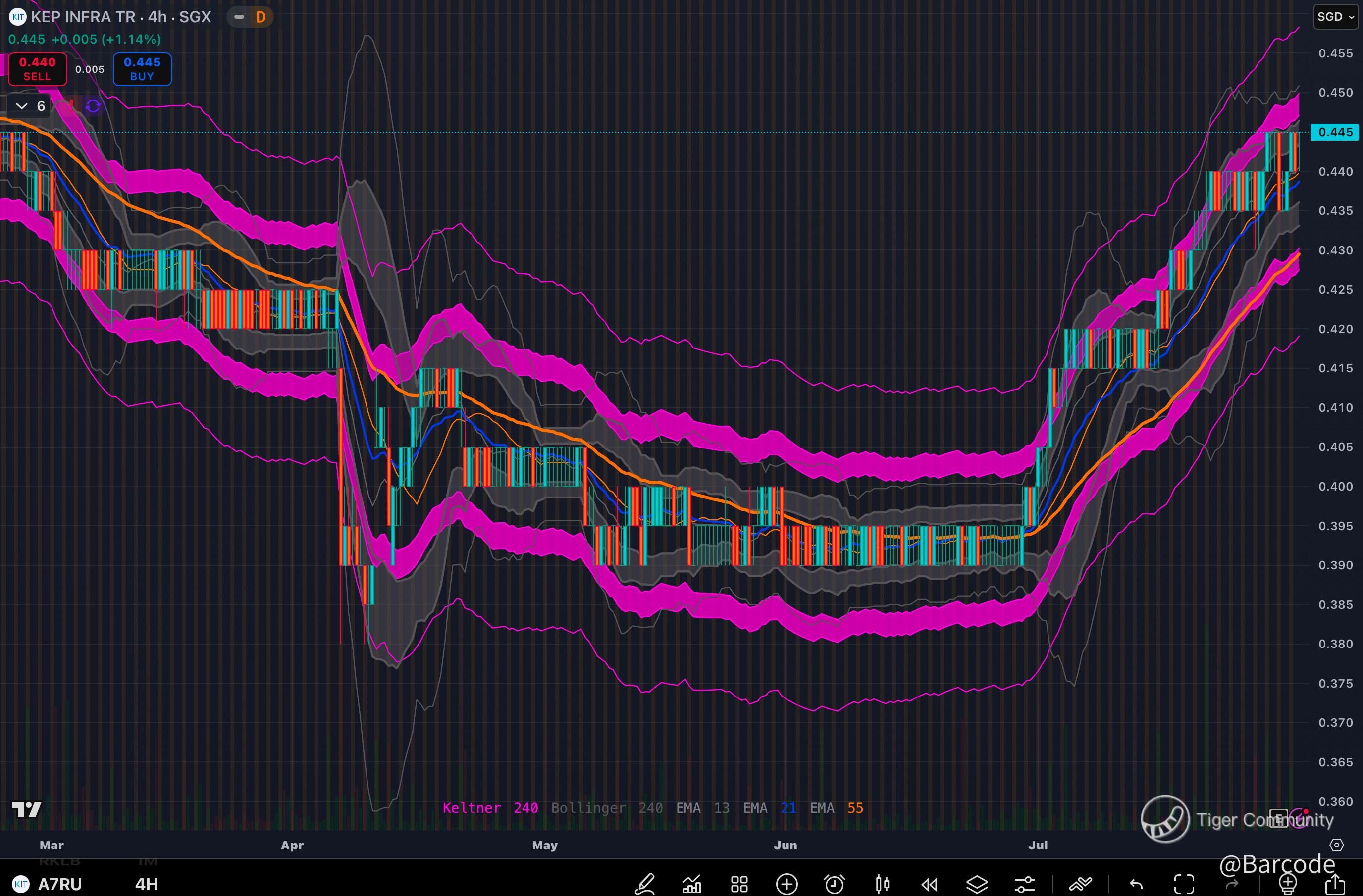 $Kep Infra Tr (A7RU.SI) posted a 31.2% leap in distributable income to S$119.4M, turning last yearβs loss into S$60M profit. With revenue up 11.5% to S$1.1B and 62% exposure to energy transition assets, the 8.11% yield suddenly looks sustainable. Technically, this is a textbook breakout. The 4H chart shows a clean surge through the Keltner and Bollinger midlines, with candles riding the upper band, backed by strong volume. EMA 13, 21, and 55 all stacked bullishly beneath price. RSI is cooling just below 70, suggesting room for continuation, especially above S$0.445. Iβm eyeing this for both income and upside.