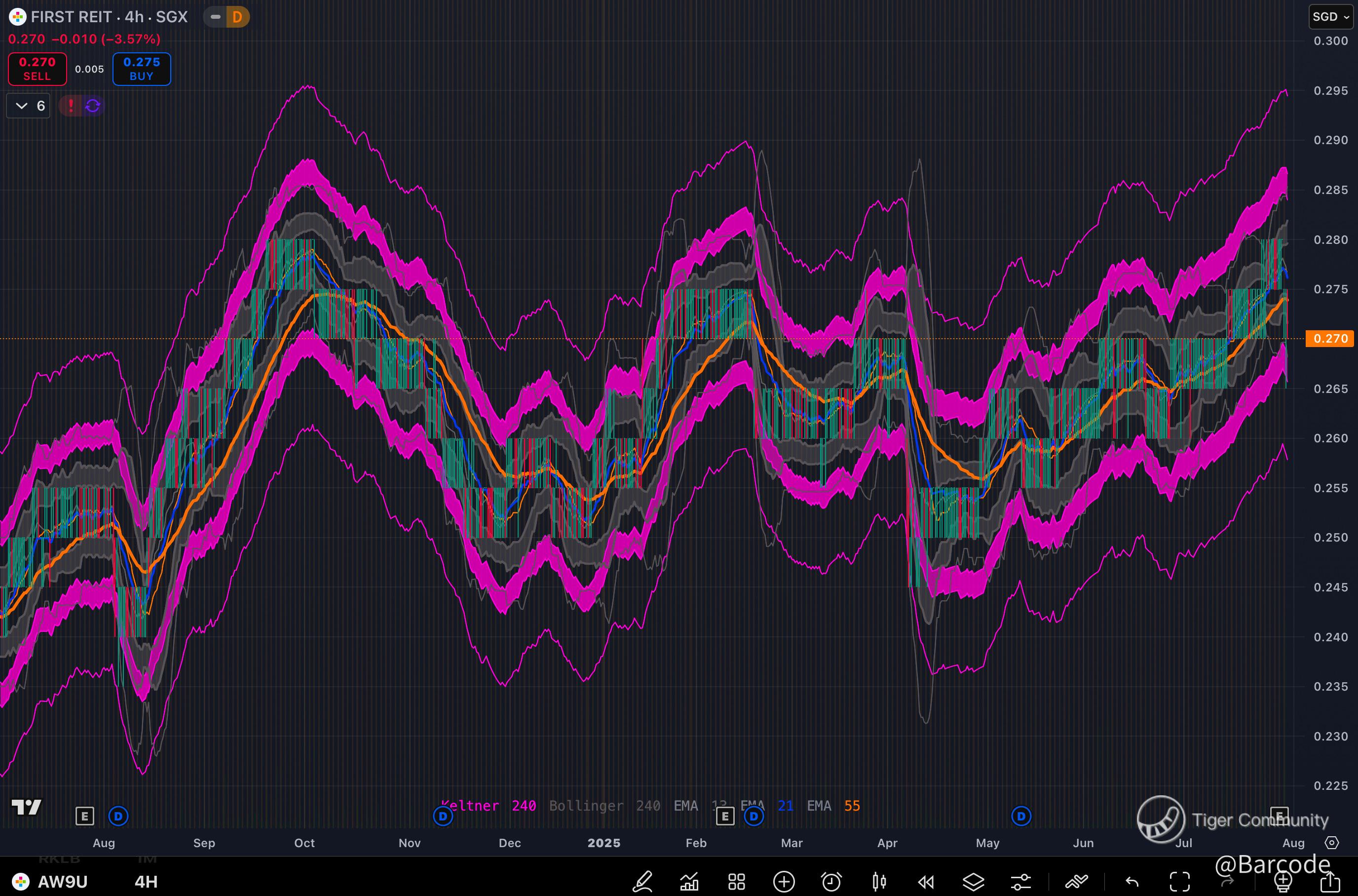 $First REIT (AW9U.SI) looks tempting with its 8.89% yield, but a deeper dive tells a different story. DPU fell 5.8% to S$0.0113, revenue dropped 12.5% to S$45.65M, and distributable income sank 4.8% due to FX drag and unit base dilution. Gearing jumped to 41.2%, making this risk-heavy. The 4H chart confirms the caution. Price reversed from near S$0.285 resistance and dropped to S$0.270, breaking below EMA 13 and testing mid-Keltner. MACD is flattening, and RSI is neutral at best. Until price clears that upper band with conviction, Iβm steering clear.