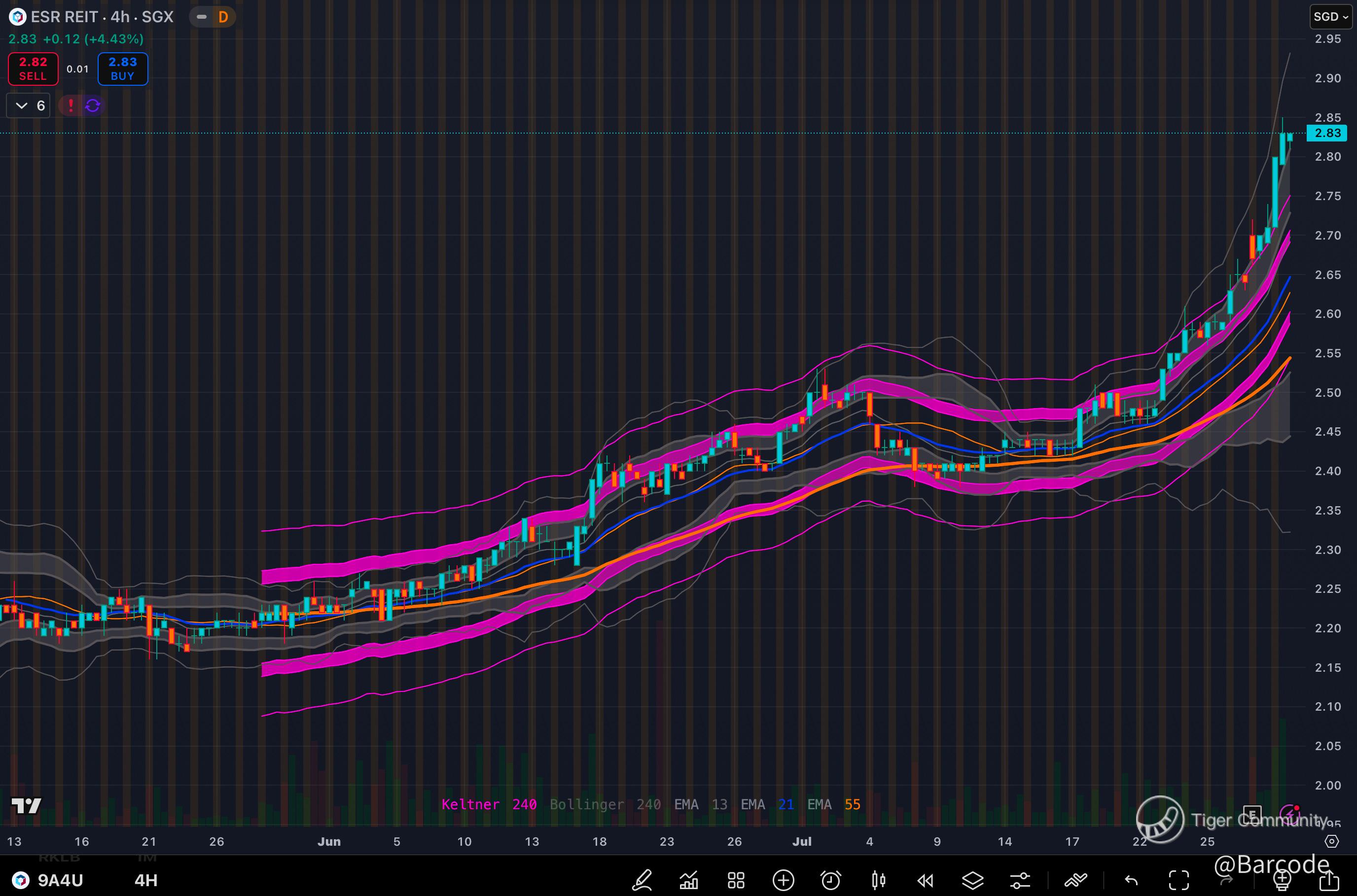$ESR REIT (9A4U.SI) just delivered an absolute standout. Revenue soared 23.2% to S$222.9M, while NPI surged 30.1% to S$166.3M. Core DPU rose 8.1%, even as total DPU held flat at 1.1239 cents. This was no fluke; its 4H chart shows an explosive vertical move with expanding candles piercing through the top of both the Keltner and Bollinger envelopes, signaling extreme momentum. Price broke clean above S$2.83 with RSI firmly over 70 and no signs of bearish divergence. MACD remains in full bull mode with rising histogram bars. This is textbook accumulation after the July pullback, now erupting on volume.