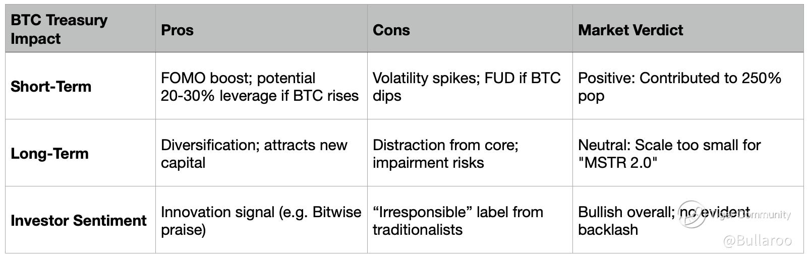 Reality? Market reaction was positive—no mass sell-off, and the strategy aligns with a 2025 trend (public firms added 131K BTC in Q2). It's not transformative like MSTR but adds optionality without dominating. For viewers: Monitor BTC correlation; if it hedges inflation effectively, it's a win—else, a minor drag.