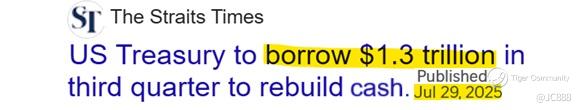On 29 Jul 2025, US Treasury department announced that it plans to borrow about $1.3 trillion in Q3 2025 and another $590 billion in Q4 2025. (see below)