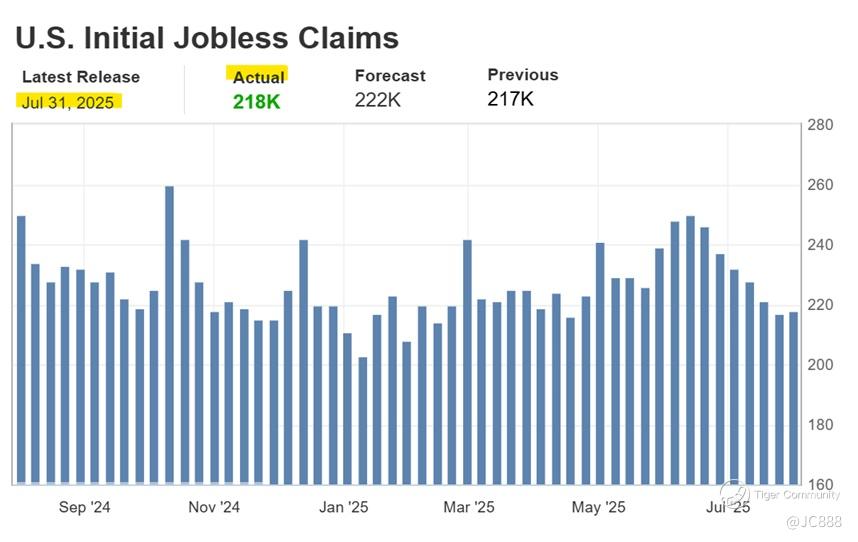 For week ending 26 Jul 2025, US weekly jobless claims rose by +1,000 claims to 218,000, from previous week’s 217,000.