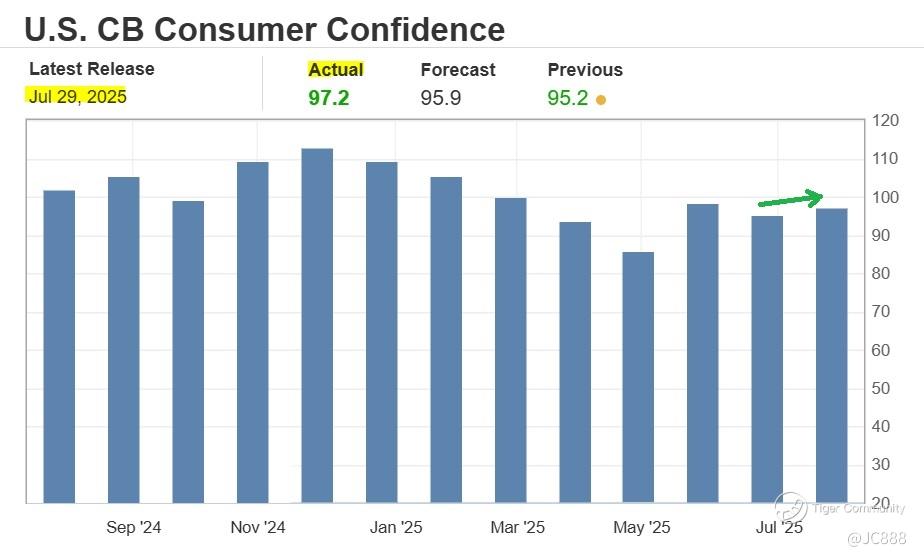 The Conference Board said on Tues, 29 Jul 2025, its consumer confidence index (July 2025) increased 2.0 points to 97.2 vs economists polled by Reuters had forecasted index would increase to 95.0.