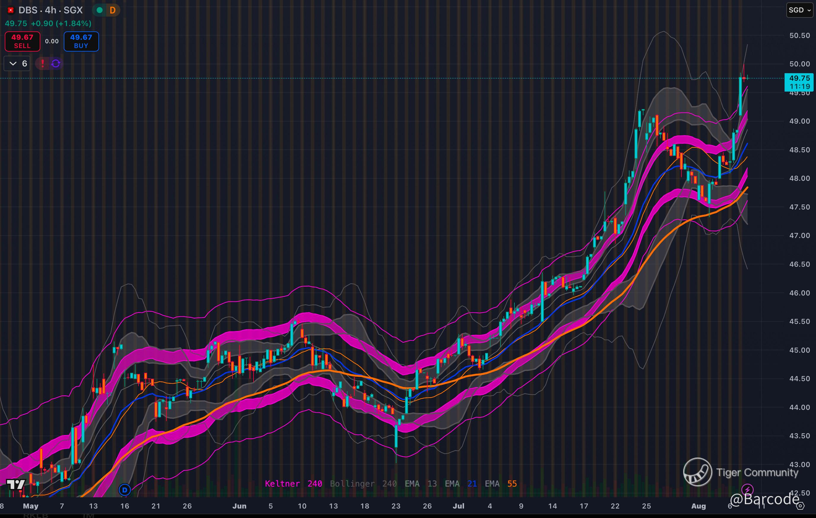 I am watching DBS ride a clean Keltner and Bollinger breakout on the 4H chart. The stock is pushing the top envelope with expanding candles and no mean reversion yet. Daily MACD has crossed bullish with momentum confirmation. Weekly price action shows a persistent uptrend hugging the upper Bollinger band, well above the 55-EMA. There’s no immediate sign of exhaustion. Volume has expanded on every breakout leg. On short interest, volume has dropped meaningfully from the July spike, confirming that the unwind is real.