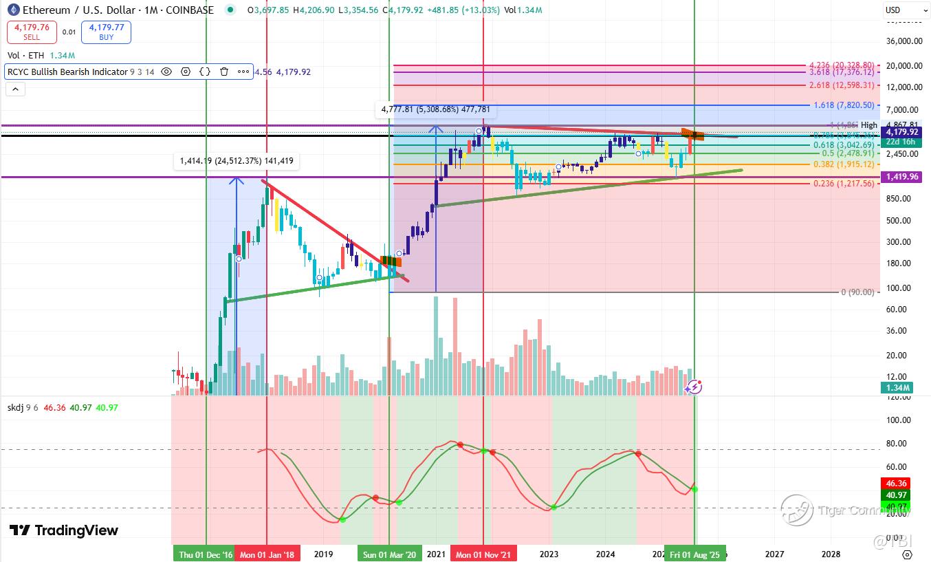Based on historical price action, a breakout has normally preceded a 1-2 year bull market for ETH. Based on Fibonacci extensions, this breakout could potentially take ETH to somewhere between 12,000 and 17,000 by 2027.