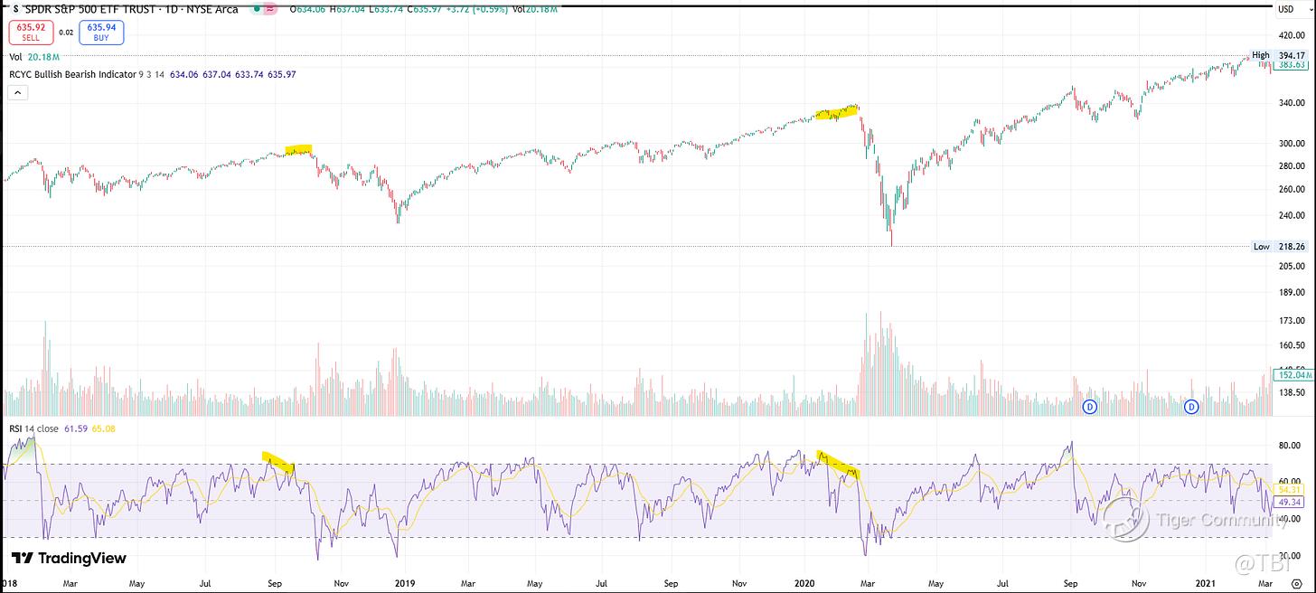 The most reliable indicator of a market top has been a bearish divergence forming on the daily SPY chart. This indicator has been reliable since 2008, preceding all major drawdowns: