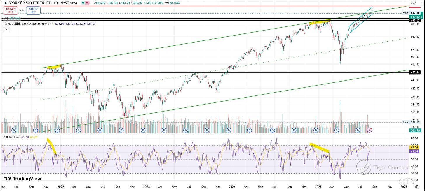 Here, we can clearly see the 2 bearish divergences that preceded the 2022 bear market and the 2024 Liberation Day correction.