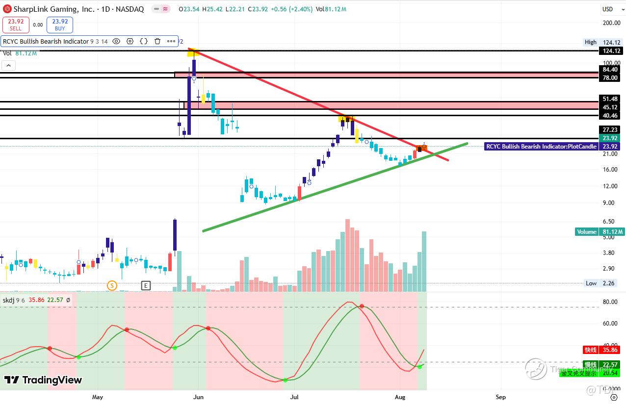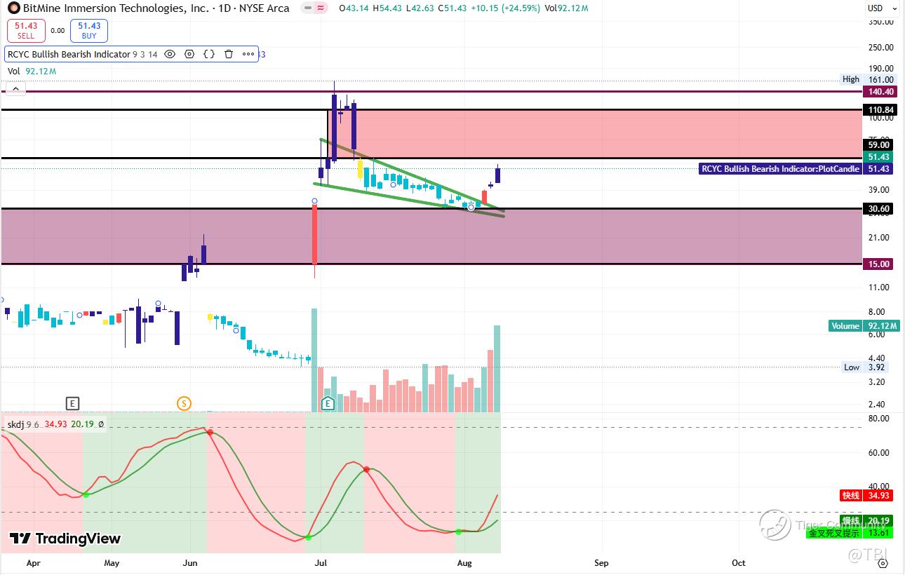 For SBET, it is clearly lagging BMNR both in terms of total ETH holdings and price action. SBET has been trying to break above this resistance trendline (in red) for the past 2 sessions. Depending on how you draw the trendline, it has either closed just below / just over it. However, the appearance of the RCYC red candle, the bullish stochastic crossover, and the continued appreciation of ETH over the weekend is likely to result in a move above 27 in the next week or so, which would definitively confirm the breakout.