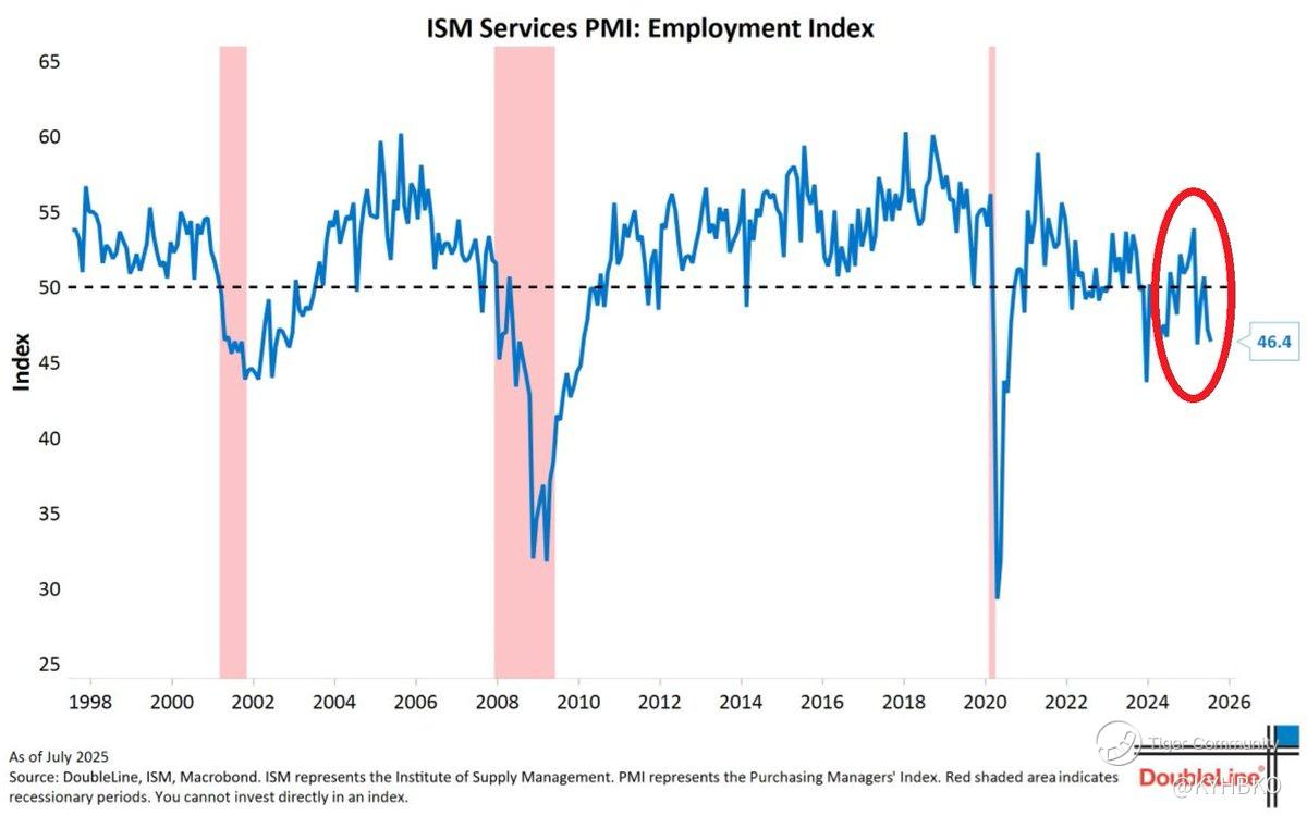 The US services employment is SHRINKING: The ISM Services PMI Employment index fell to 46.4 points, one of the lowest readings since the 2020 Crisis. Employment has now contracted in 4 out of the last 5 months. This has rarely happened outside of a recession in the past. - X user Global Markets Investor
