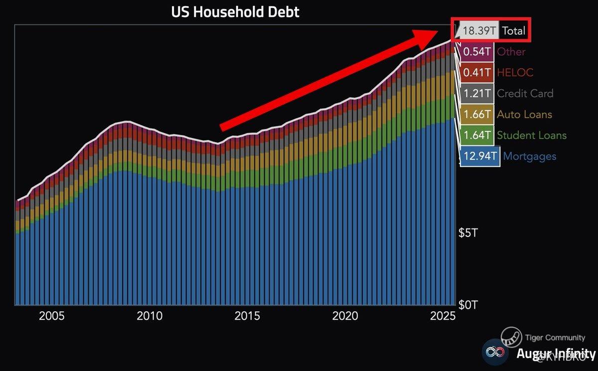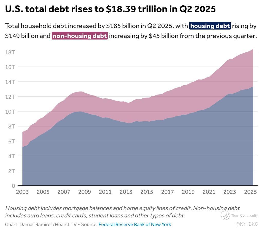 US household debt rose $185 billion, to a record $18.4 TRILLION in Q2 2025. In 10 years, household debt has surged by a MASSIVE $7 TRILLION.