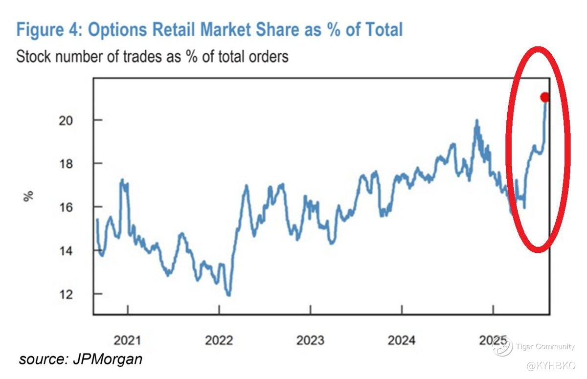 Retail investors' share in the options market has exceeded 20% for the first time in HISTORY. Over the last few weeks, the retail options activity has SKYROCKETED. This is ~5 percentage points above the meme stock frenzy peak in 2021. - X user Global Markets Investor