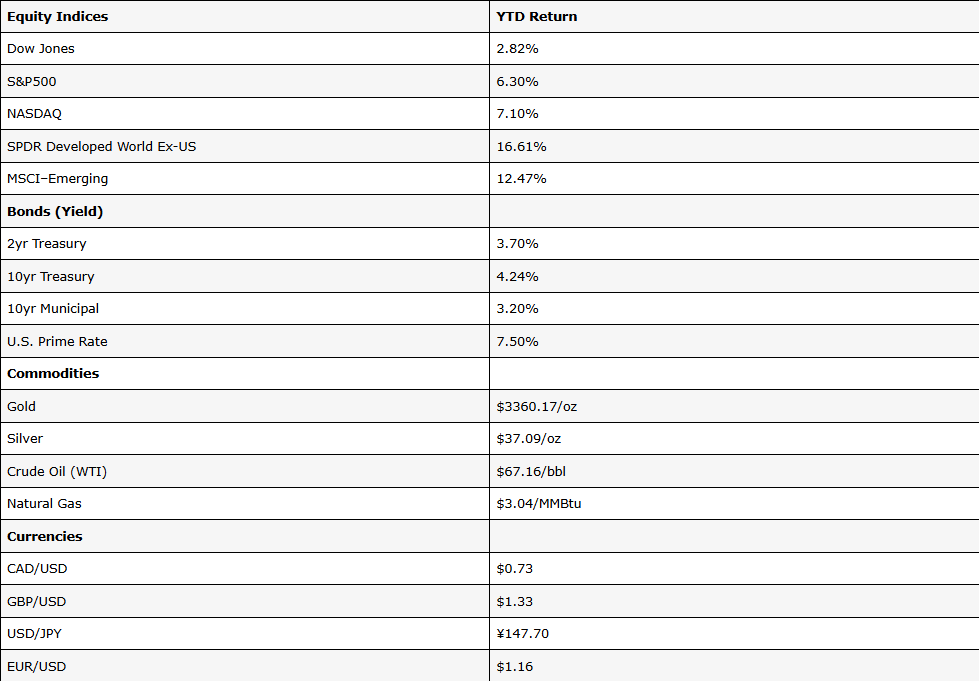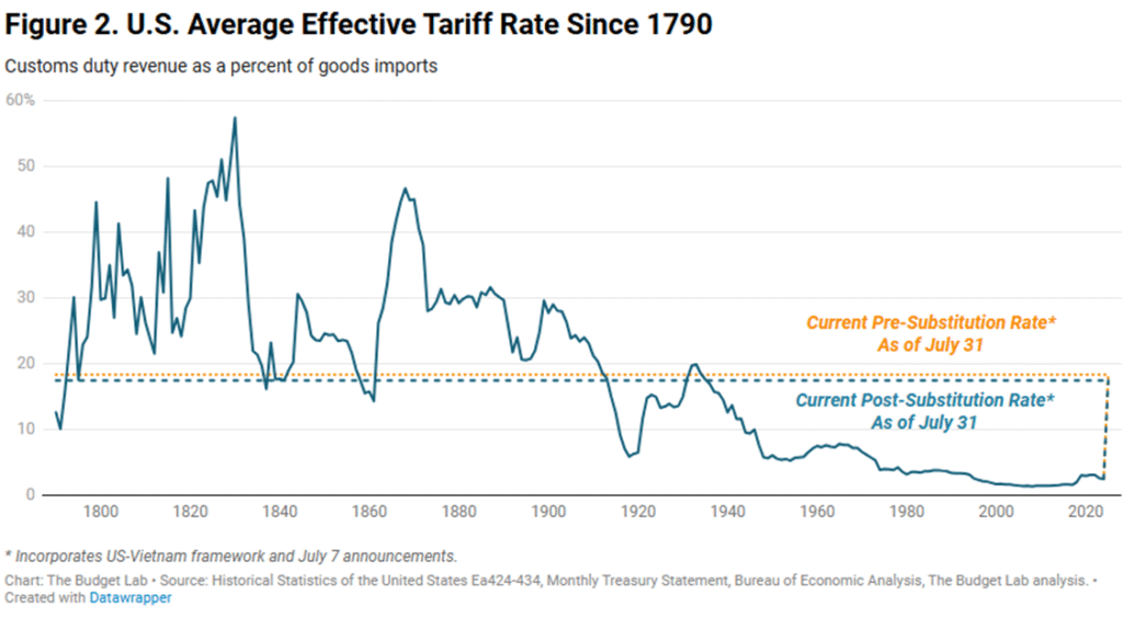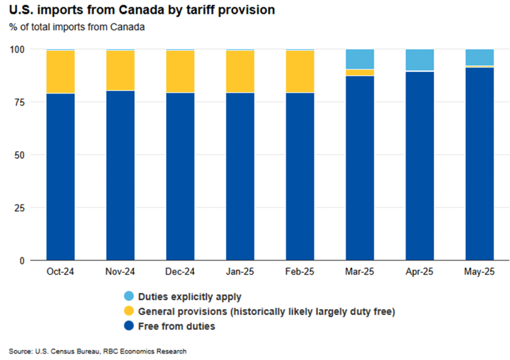 Several revised tariff figures were announced in mid July, the new duties are based on whether a nation was able to negotiate a revised trade agreement with the United States. Key rates include a 50% rate for Brazil, 39% for Switzerland, 25% for India, and 40% for Laos. The European Union negotiated a 15% rate for most goods, a significant increase from the previous 4.8% average, but lower than the 30% threatened. Thailand secured a 19% tariff, reduced from a threatened 36%. The Canadian rate was increased to 35%, from 25%, though it appears that at this time that goods governed under CUSMA are exempt – which is north of 95% of goods. According to RBC the CUMSA exemption has resulted in the effective tariff rate being around 5% though it is becoming more difficult to estimate which goods apply, and which do not given the piecemeal policy.