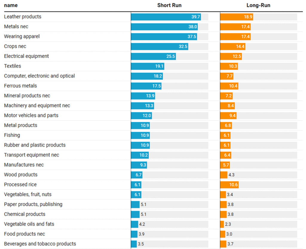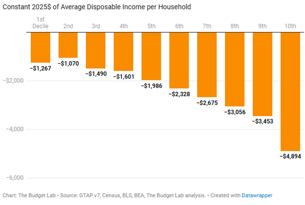 The median cost per household is estimated now to be $2,200 annually. Consumers face high increases in clothing and textile prices in the short-term, with an estimated 38% increase on apparel. Though Yale estimates shifts toward tariff-free manufacturing will likely reduce this to 17% in the long-run.