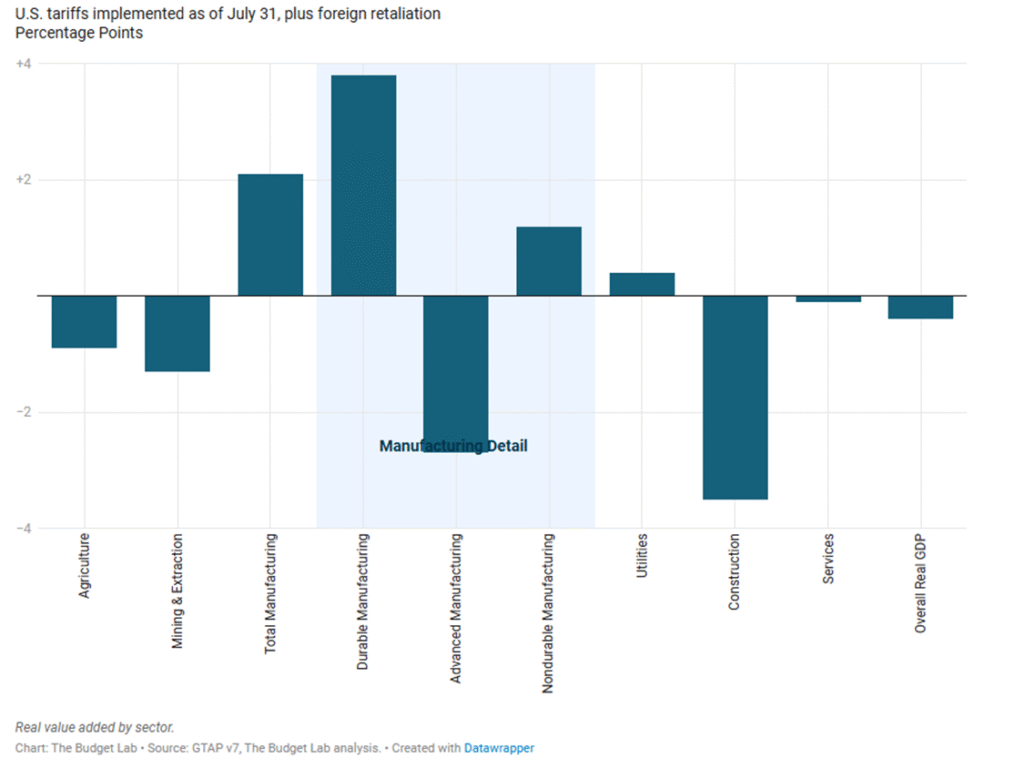 The Yale Budget lab now estimates that as importers shift away from tariffed goods, the effective tariff rate will still be the highest rate since the 1930s at 18.3%. In the aggregate, real GDP growth will likely be weighted down by around 40bps over the long term, with peak unemployment effect being 70bps higher by the end of 2026. Ironically, the hardest hit is expected to be advanced manufacturing, where the US still holds a competitive advantage.