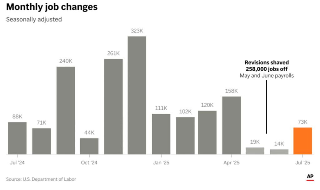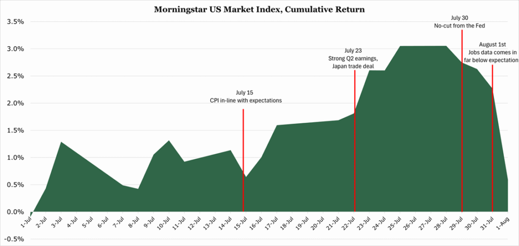 The final week of July was the worst week for the market since the early April tariff announcements. The sell-off was driven by a new round of tariffs, and jobs data that showed deepening cracks in the labor market. Since April, 258,000 jobs had been revised out of previous jobs reports, and a weak 73,000 were created in July. Total unemployment remained steady at 4.2%.