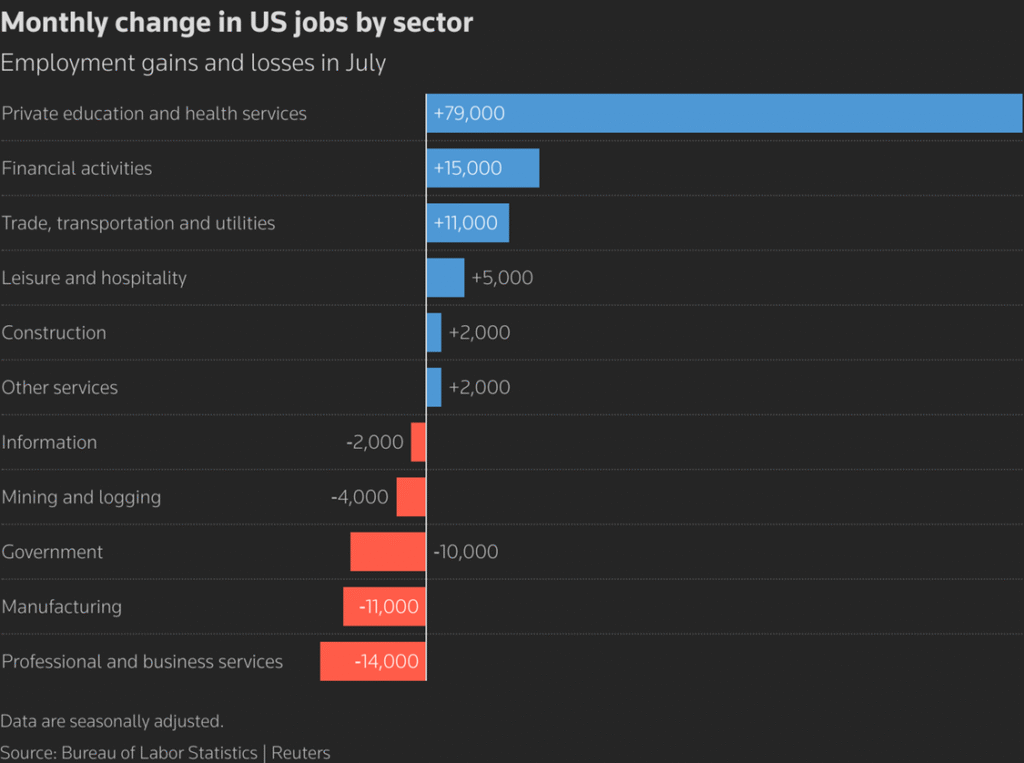 The dissenters argued that the Fed should “look through” the temporary, “one-off” price increases caused by tariffs and focus on the weakening economic outlook, especially around the labor market. The dissenters may have been right to be concerned about the job market, as previously discussed, two days later more than 258,000 jobs had been revised out of previous jobs reports, and a weak 73,000 jobs were created in July.