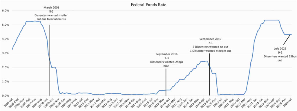 With the introduction of tariffs, which add uncertainty and inflationary pressure, the Fed once again elected to keep rates steady. The result was a 9-2 decision, the most split the FOMC has been since September 2019 and one of the few times since the global financial crisis the FOMC has been split on matters of rates.