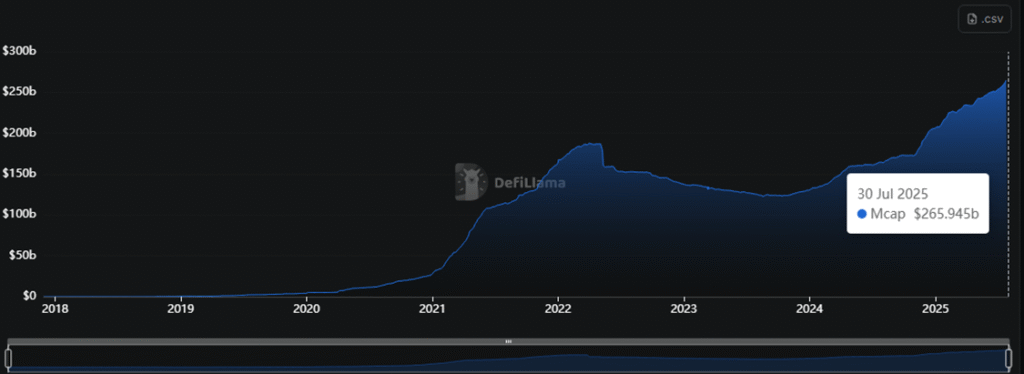 As of the end of July, the stablecoin market is around $267 billion, growing more than $2 billion per week thus far in 2025 with the entrance of traditional financial institutions and even payment processors into the market.