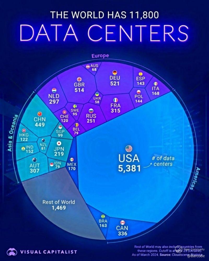 • Data centres: ~11,800 globally, led by U.S., Europe, 🇨🇳 China, and 🇯🇵 Japan.