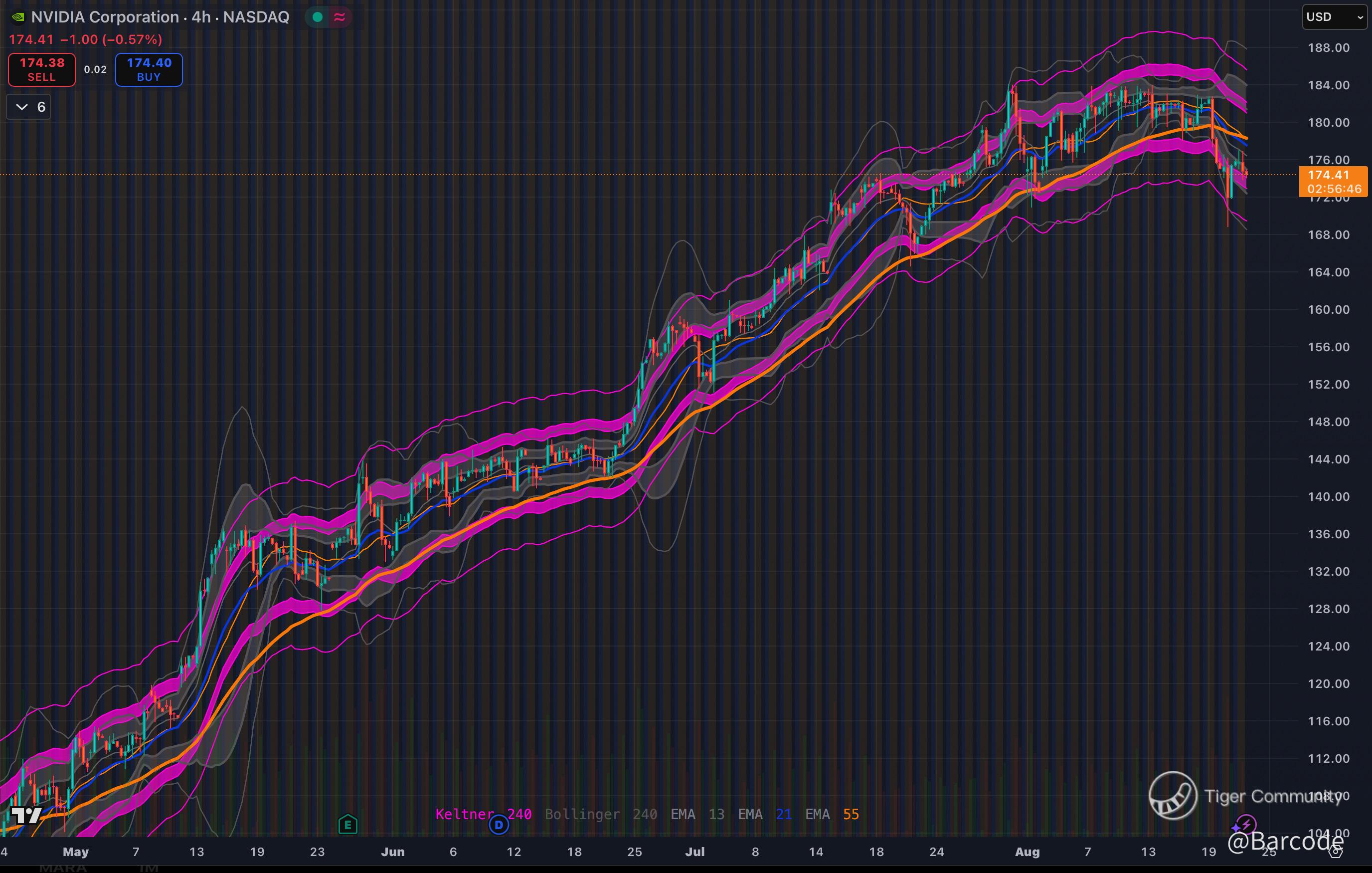 • 4H overlays: Keltner and Bollinger bands show oversold touch at 172–175. EMAs 13, 21, 55.