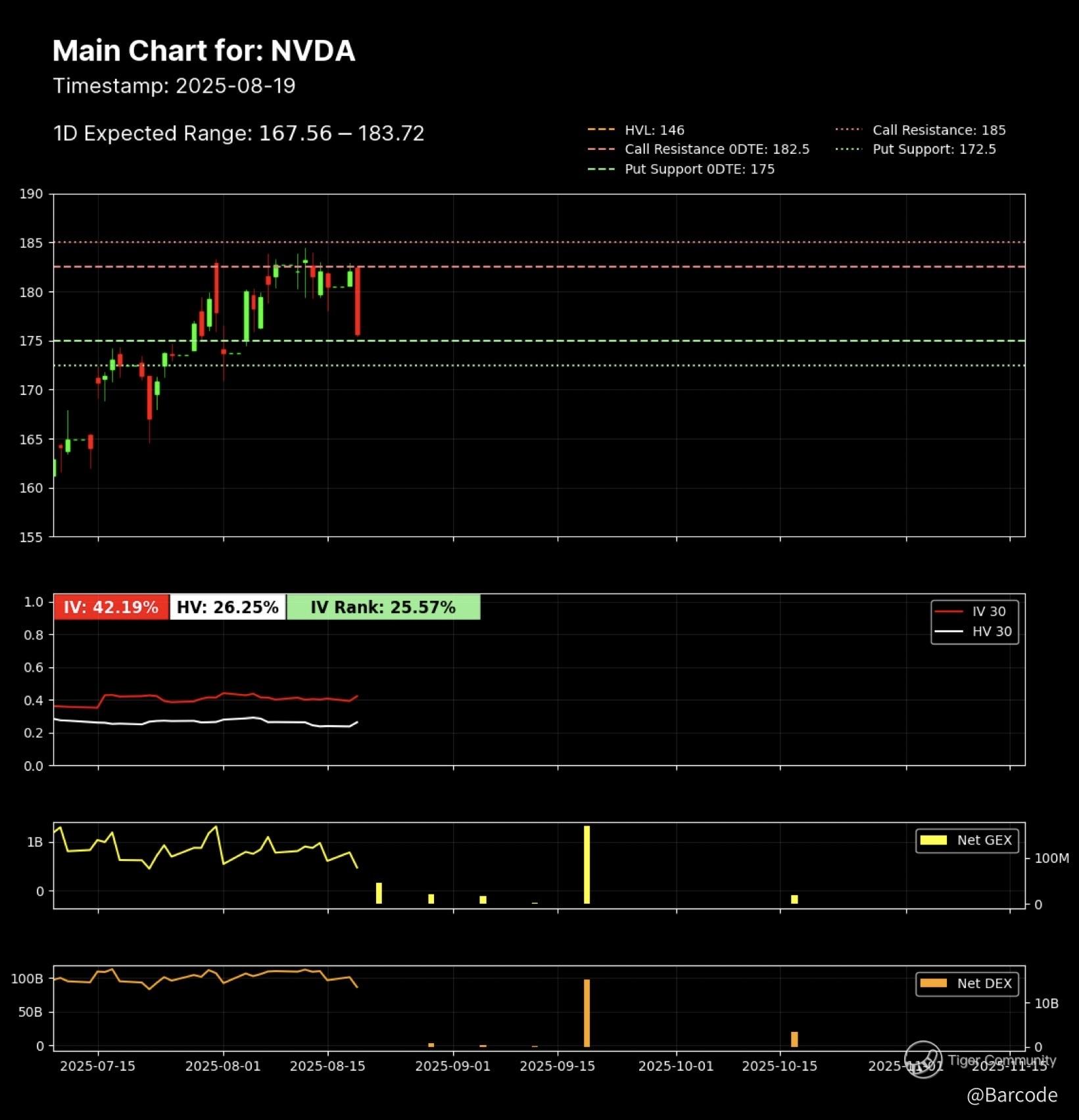 NVDA is near 175.4, coiled between put support 172.5 and resistance 182.88 to 185. IV 30 is 42.19 percent versus HV 30 at 26.25 percent, with IV Rank 25.57 percent. The 1-day expected range printed 167.56 to 183.72. Flow confirms positioning: five late prints pinned at 175.4 with premiums of 94.2M, 99.9M, 34.8M, 36.4M, and 35.1M. Large dark-pool blocks across the Mag 7 include $MSFT 1.6B at 505.72, $AAPL 905M at 226.01, $AMZN 690M at 223.81, and $NVDA 300M at 175.4. As always, mark these lvls on your charts.