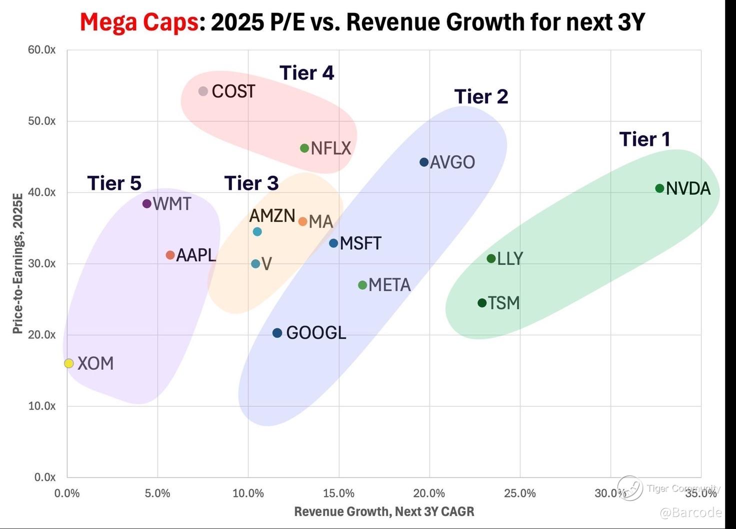 • Mega-cap tiering: NVDA, LLY, TSM elite growth; MSFT, META, GOOGL strong growth; AMZN, MA, V balanced; NFLX, COST premium-moderate; AAPL, WMT, XOM low-growth premium.