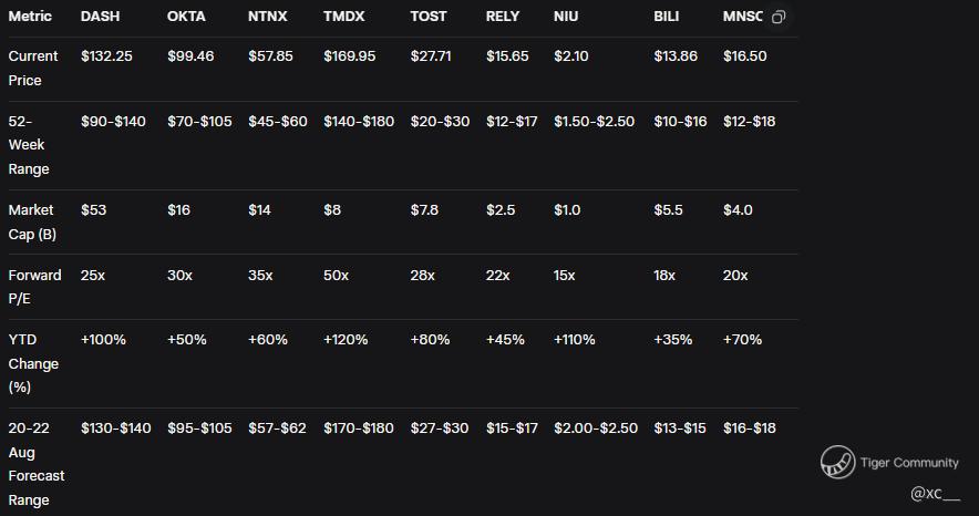 I’m diving into these profit turnarounds with a focused strategy. I’ll buy DASH at $130-$132, targeting $140, with a $128 stop, betting on GOV growth. I’ll add OKTA at $95-$97, aiming for $105, with a $93 stop, on subscription strength. I’ll include NTNX at $57-$58, targeting $62, with a $55 stop, TMDX at $168-$170, targeting $180, with a $165 stop, and TOST at $27-$28, targeting $32, with a $26 stop. For the ADRs, I’ll buy NIU at $2.00-$2.10, targeting $2.50, with a $1.90 stop, BILI at $13.50-$14, targeting $15, with a $13 stop, and MNSO at $16-$16.50, targeting $18, with a $15.50 stop. I’ll hedge with VIXY at $14, targeting $16, and hold 20% cash for a dip to $120 (DASH) or tariff news. I’ll watch Q3 guidance and consumer data closely.