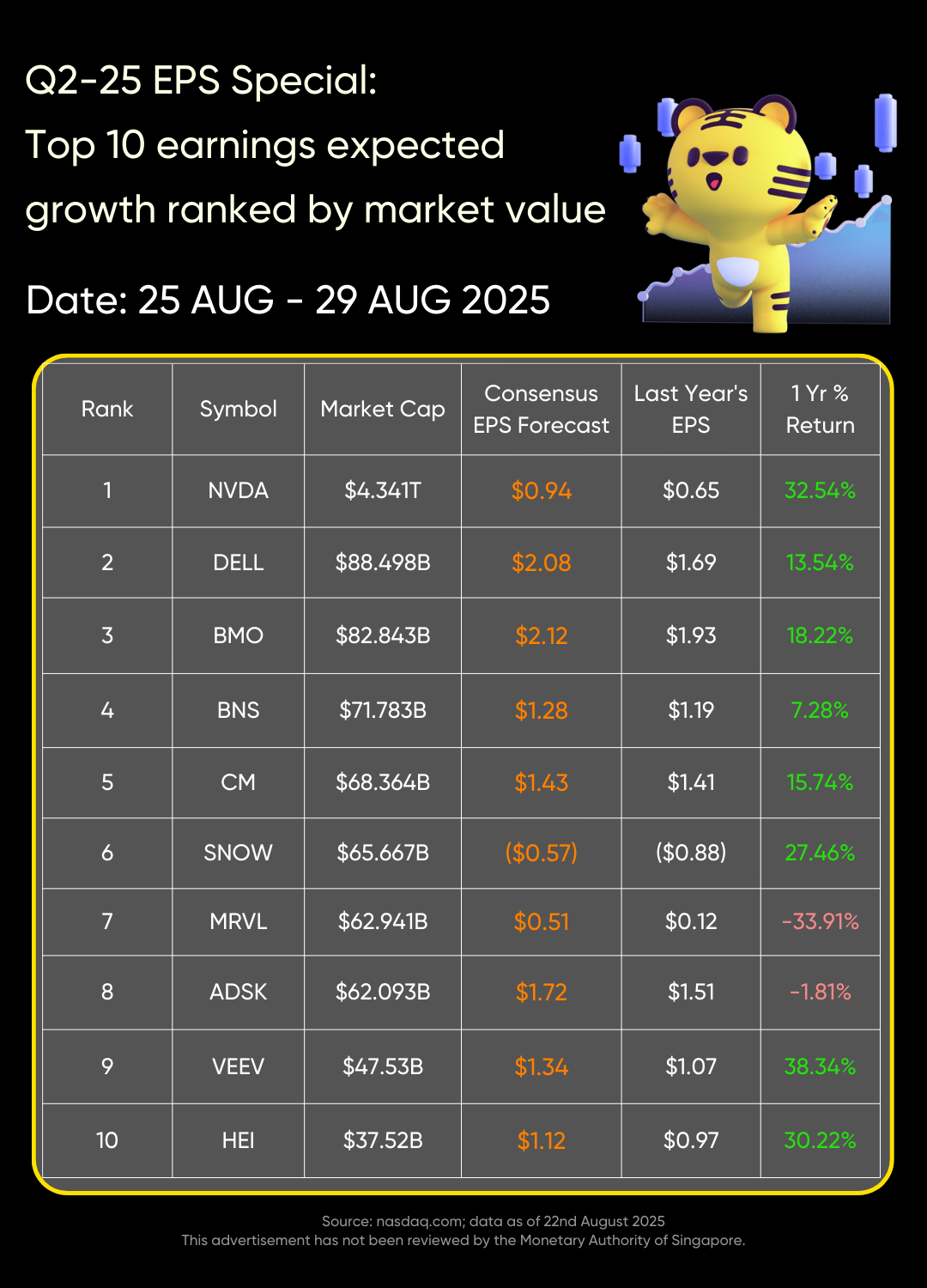 On August 25 to August 29, $NVIDIA(NVDA)$ , $Dell Technologies Inc.(DELL)$ , $Bank of Nova Scotia(BNS)$ , $Canadian Imperial Bank of Commerce(CM)$ , $Snowflake(SNOW)$ , $Marvell Technology(MRVL)$ , $Autodesk(ADSK)$ , $Veeva(VEEV)$ , $Heico(HEI)$ , $Agilent(A)$ , $Affirm Holdings, Inc.(AFRM)$ , $Williams-Sonoma(WSM)$ , $Nutanix Inc.(NTNX)$ , $MongoDB Inc.(MDB)$ , $Burlington(BURL)$ , $Okta Inc.(OKTA)$ , $Hormel(HRL)$ , $Cooper(COO)$ and $Donaldson(DCI)$ are expected to release their earnings, and consensus earnings per share forecasts are higher than data from the same period last year.