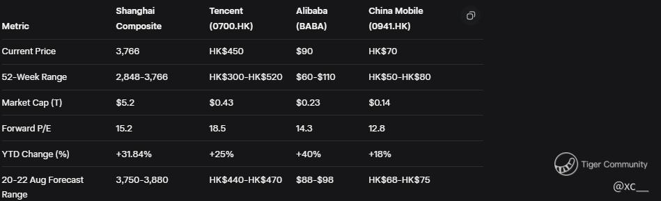 The Shanghai Composite’s climb to 3,766 on August 20, 2025, a near 10-year high with a 31.84% yearly gain, contrasts with muted “bull market” sentiment on WeChat, amid a 6,466.58 S&P 500 and $115,000 Bitcoin. A 3-5% rise to 3,880-3,950 is possible this week if 3,700 holds, with a 12-month target of 4,500 (19% upside) by 2026 if undervaluation corrects. A 3-6% dip to 3,550-3,650 risks if sentiment cracks or tariffs escalate, with 3,500 as support. The 15.2x P/E and $5.2 trillion cap suggest value, but deflation and capital flight risks linger. Double down with VIXY or GLD hedges, or cash out—your choice could define your portfolio.