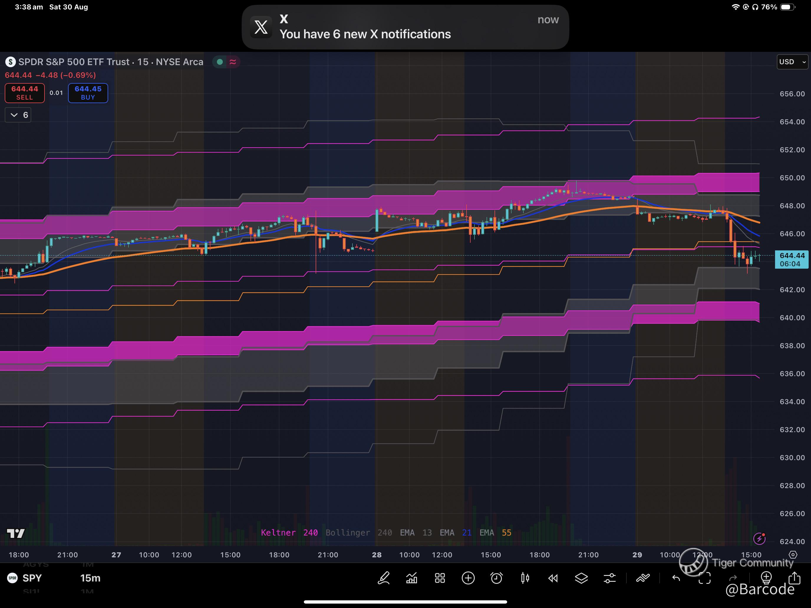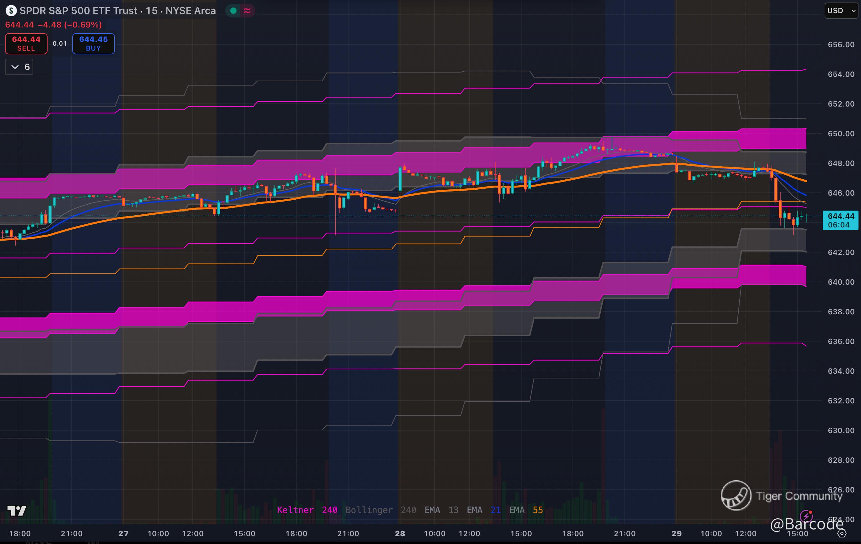 Iโm tracking intraday rejections at $644.85 and immediate support at $643.34, with $642.78 beneath. Multiple uploaded Keltner and Bollinger overlays show SPY compressing inside narrowing bands, signaling volatility expansion is ahead. The 5m breakdown chart confirmed the opening range break, aligning with end-of-month sell pressure.