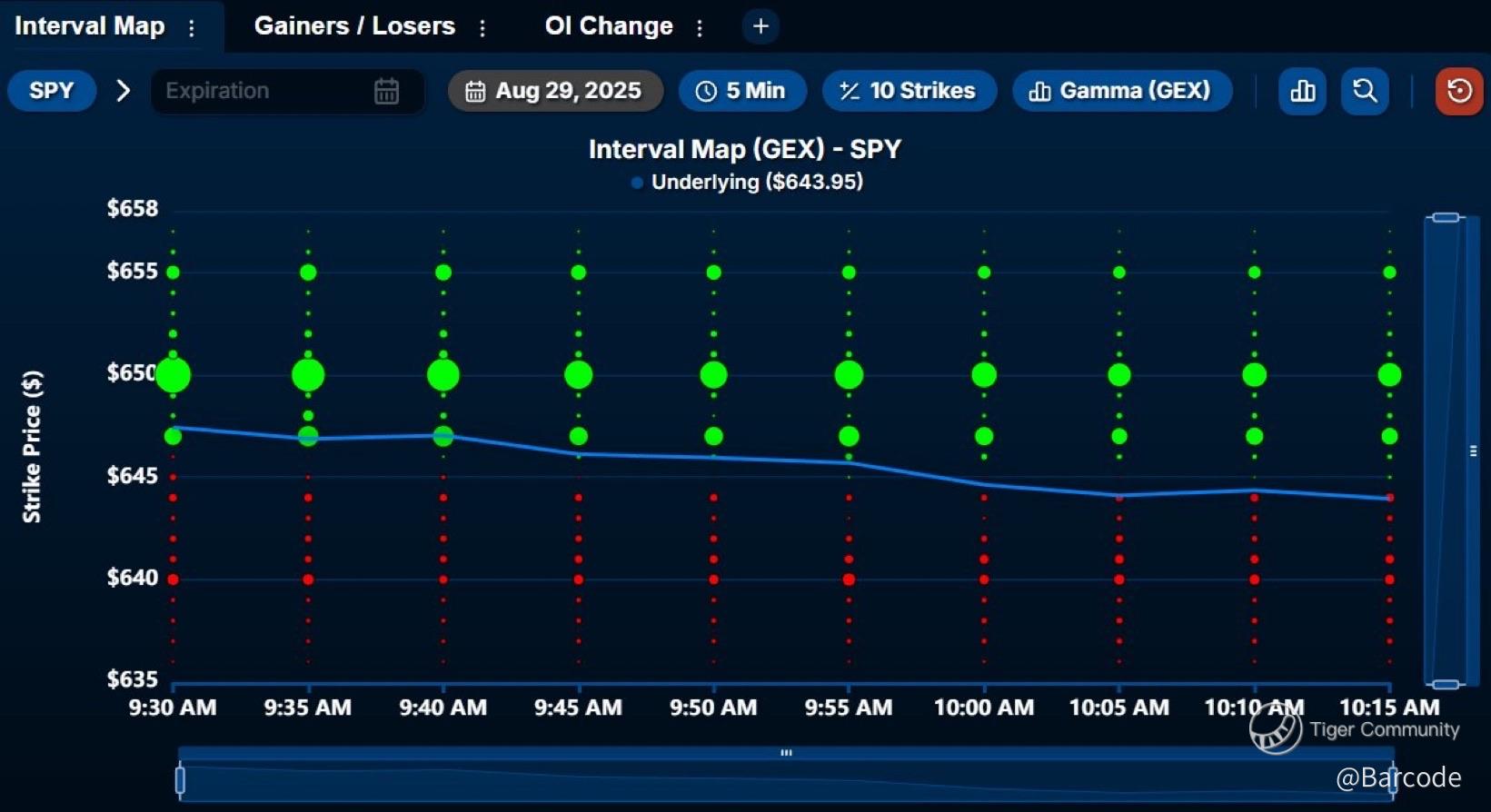 Gamma exposure clustered at $650 earlier but faded as SPY slipped, leaving little negative gamma under spot. That means dealers arenโt forced into aggressive downside hedging yet, suggesting a grind lower rather than panic.