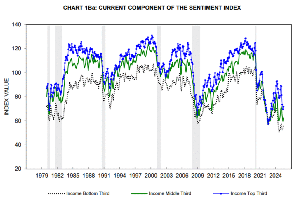 While the income gap is always obvious in the consumer sentiment index, it is notable that middle income and lower income consumers have far worse current sentiment than the 2008 financial crisis, and the lowest levels since the survey began in 1979.
