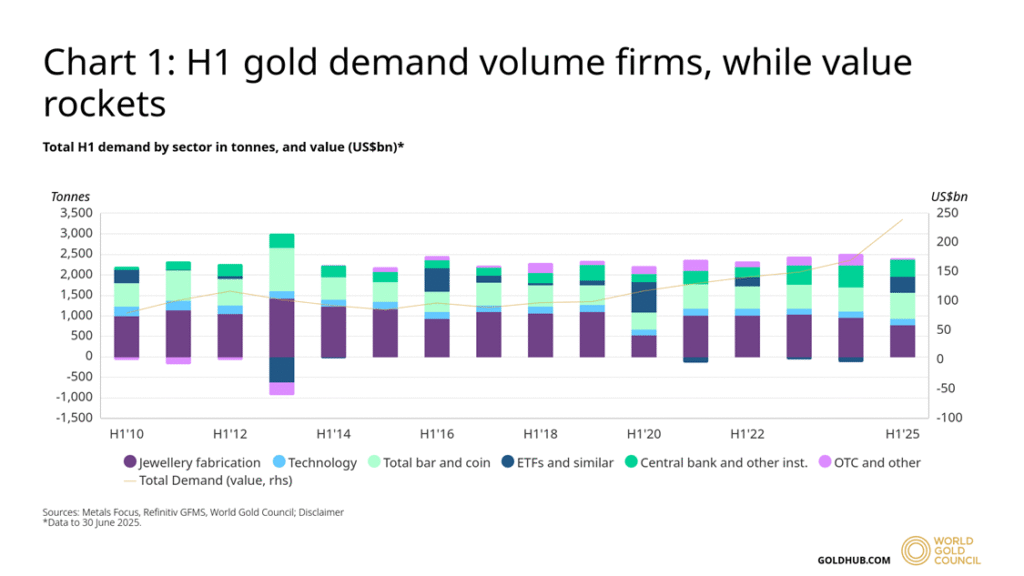 Gold demand increased by 3% during the first half of 2025, roughly matching total supply increases. Jewelry demand fell to pandemic levels, though recycling activity also declined despite high prices. According to the World Gold Council, Indian consumers who makes up much of gold recycling activity have elected to exchange old jewelry or pledged it as collateral against loans. However, the overall decline in jewelry buying activity was offset by strong investment inflows and technology demand with the buildout of AI datacenters.