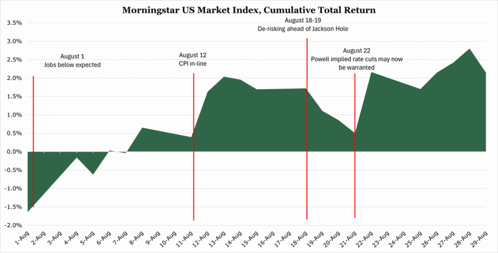 Despite a rocky start to the month, August saw Morningstar’s US Market index up on the month 2.1%, with the S&P500 up 1.9%. The Fed’s Jackson Hole meeting initially caused a broad de-risking that ended up boosting returns as investors now fully expect the Fed to cut during the September meeting.