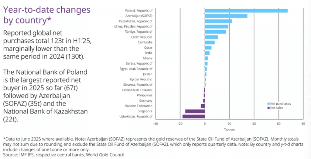 Though to the end of June 2025, the largest importer of gold was Poland, buying a net 67 tons.