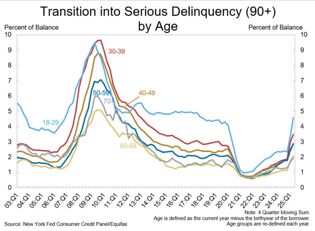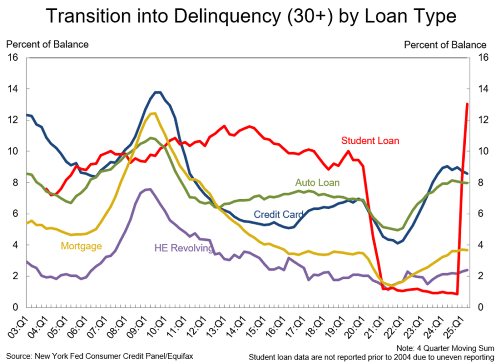 Transitions to delinquency are elevated across high-interest categories like auto and credit cards. Credit cards are at their highest delinquency level in 14 years. On 30+ day delinquency data, the most glaring spike is student loan transitions, with the end of a Biden-era policy that suspended payments as a form of COVID relief.