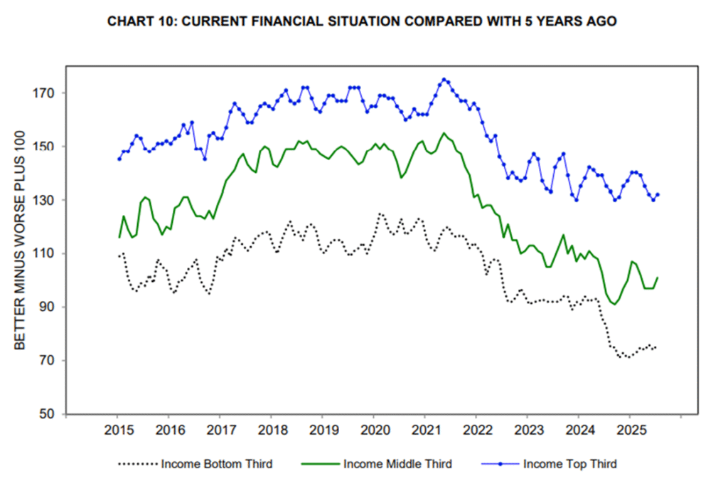 With most COVID-era relief now rolled off, the lowest third of consumers overall rate themselves far worse off than the same time in 2020.
