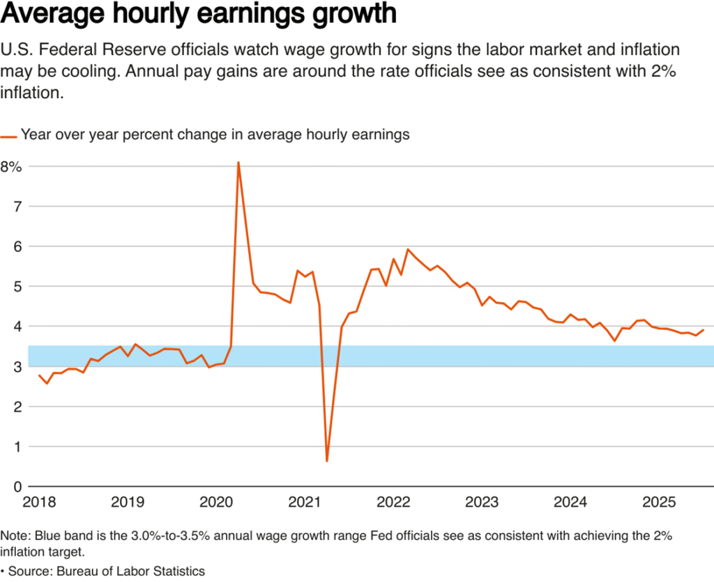 However, the story has now become one of balancing jobs with the price level. Job growth since June has been the worst since the pandemic, and the worst since the 2008 financial crisis. Yet, unemployment remains at 4.2%, near the Fed’s target of 4.0%. Powell even implied in his speech that it may be time to “balance” options, and that preserving full employment may become more important than returning the price level to the 2.0% target. Looking at other potential metrics, like wage growth, shows that inflation may be closer to its target than it appears based on headline data.