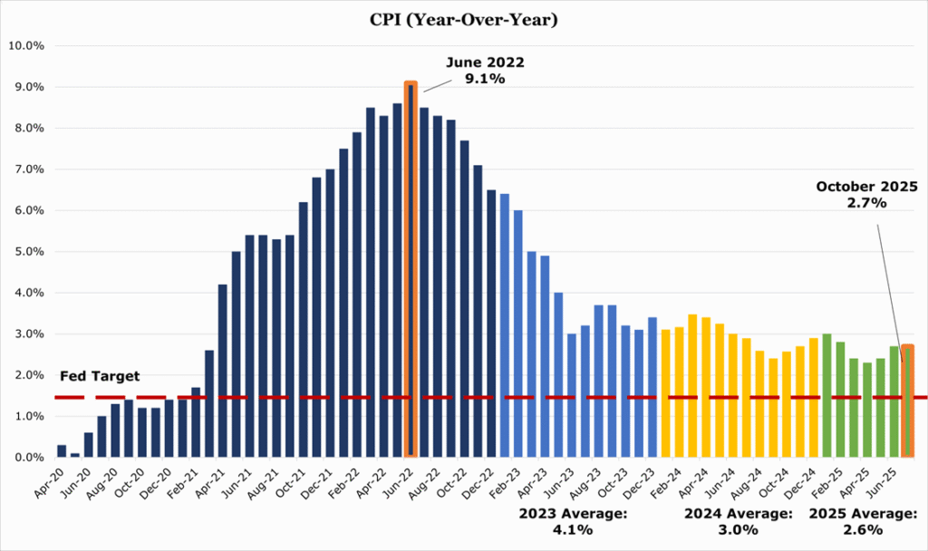 Inflation came in at expectations, with CPI posting 2.7% month over month annualized. The long-term trend is a continuous move down toward the Fed’s 2.0% target, though progress once again appears to be stalling.