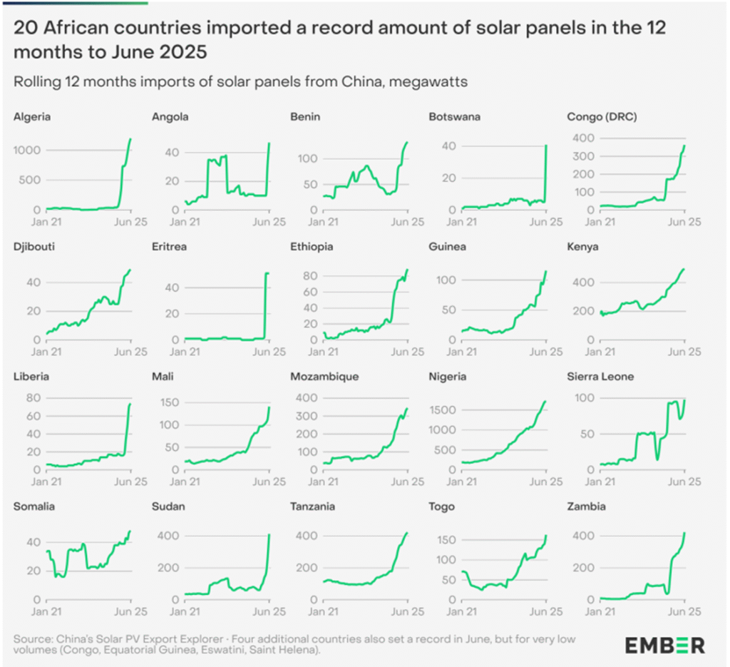According to research firm Ember Energy, Africa has grown its solar imports more than 60% in the trailing twelve months ending June 2025. The importers are incredibly diverse and span the continent with 25 countries importing more than 100MW, of those 16 are set to add at least 5% to their grid capacity utilizing solar.