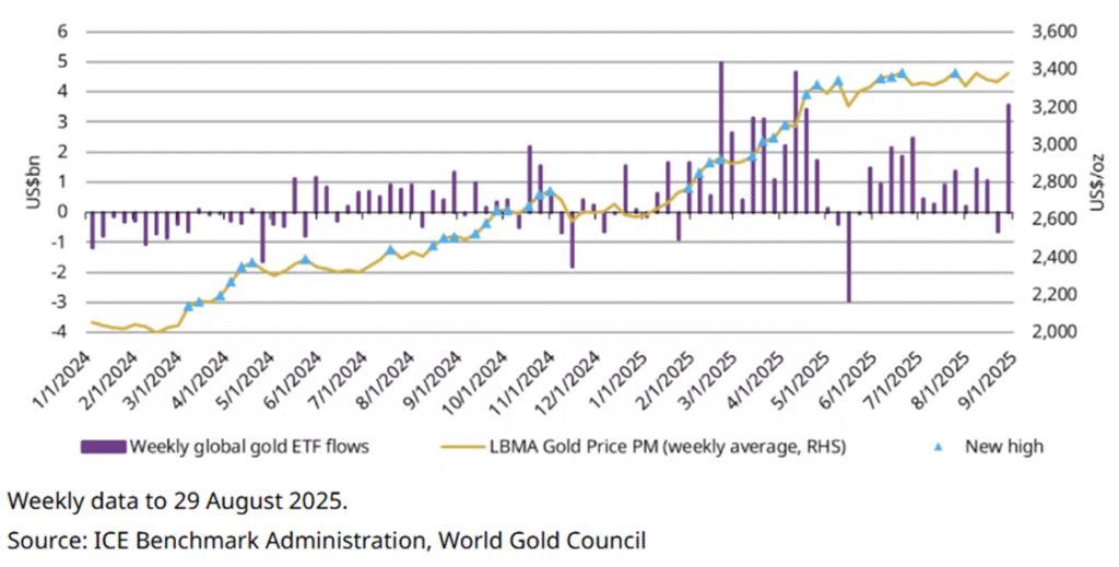 Concerns over Fed independence and broad expectations for a rate cut before inflation is fully tamed sent gold to near its highs in late August. Gold ETFs saw a further spike in inflows after a relative lull compared to the activity in early 2025.