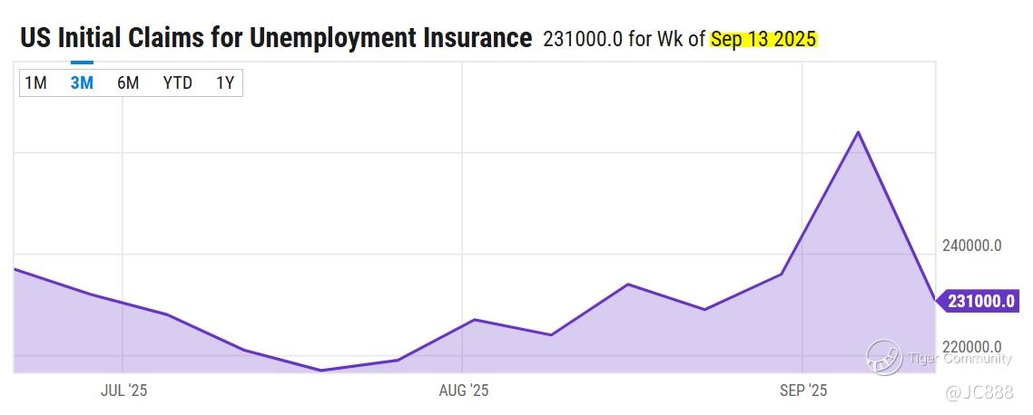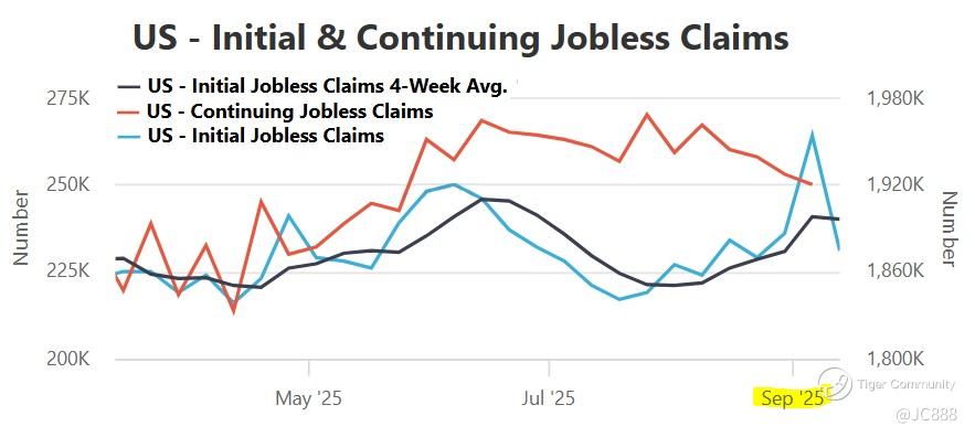 For week ending 13 Sep 2025, US weekly jobless claims fell by -33,000 claims to 231,000, indicating a slight improvement after a spike the prior week. (see above)