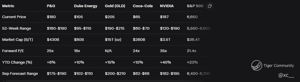 • Staples and Utilities: Procter & Gamble at $180 up 8% YTD and Duke Energy at $105 up 10% provide steady dividends.