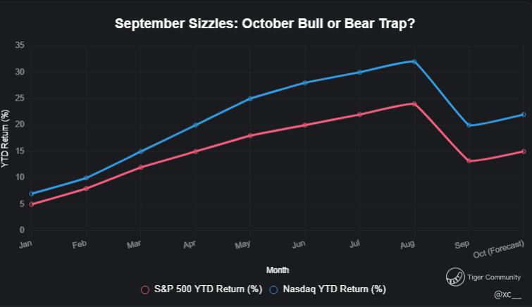 $NVIDIA(NVDA)$ $S&P 500(.SPX)$ $Alibaba(BABA)$ $Apple(AAPL)$ $Tesla Motors(TSLA)$ $NASDAQ(.IXIC)$ September defied the bears, delivering a 13.25% YTD S&P 500 gain and 20% for Nasdaq, smashing expectations of a correction. Yet October’s historical red streak—down in 10 of the last 15 years—looms large, though last year’s mere 0.99% dip post-rally suggests resilience. With the S&P 500 at 6,650 and Nasdaq at 22,200, the bull’s momentum feels young, but Powell’s overvaluation warning and strong data add caution. Did you catch the September winners like TSLA (+27%), AAPL (+4.3%), NVDA (+28.83%), BABA (+10%)? Are you betting on October’s continuation, a mild pullback, or a crash? Dive into the trends, spotlight key movers, and map your strategy for the month ahead.