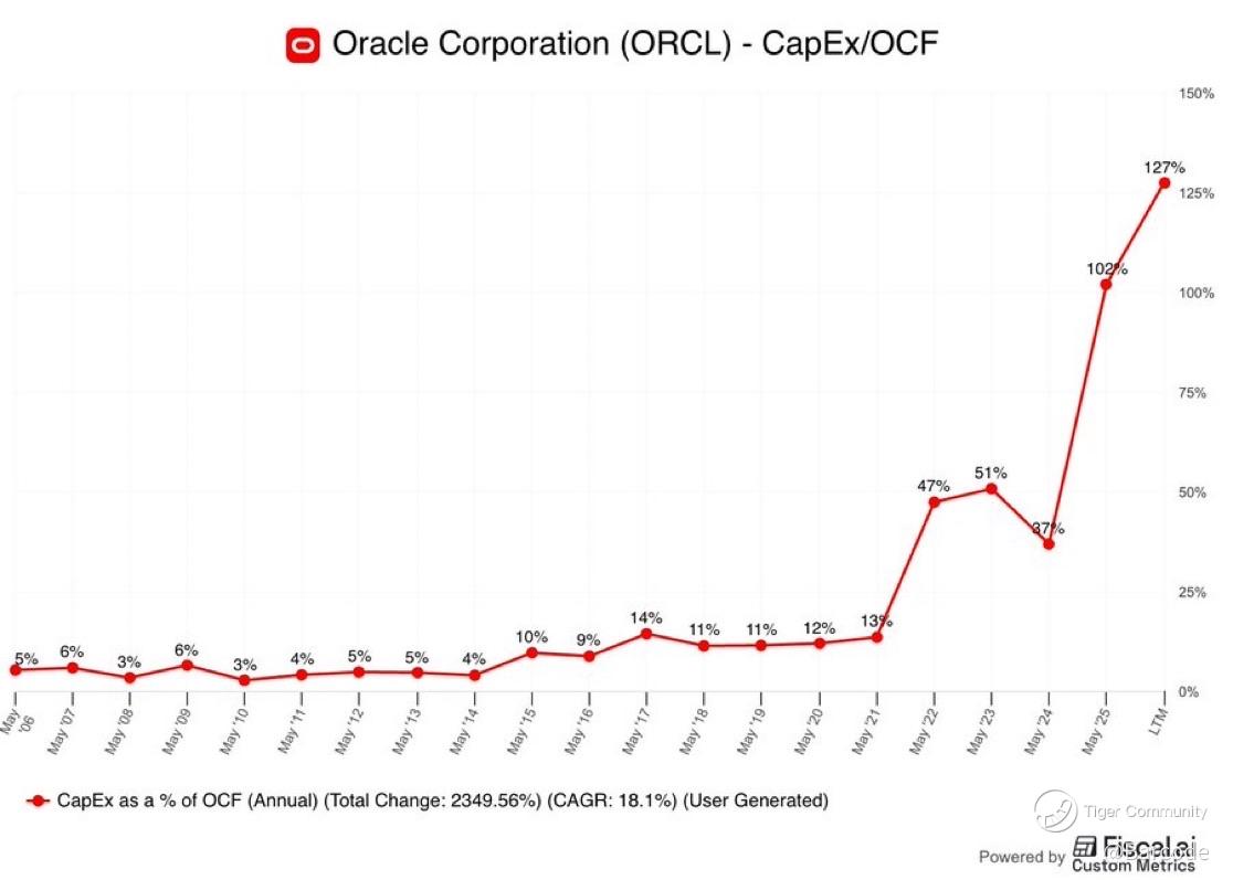 🧠 Oracle’s CapEx as a percentage of operating cash flow has gone parabolic, climbing from a stable 3–14% range over the past two decades to a staggering 127% in the latest period. That means Oracle is spending more than it generates in cash flow to fund its infrastructure ambitions. Historically, the company operated as a capital-light software player. Now it’s all-in on a physical buildout to chase the AI and cloud opportunity.