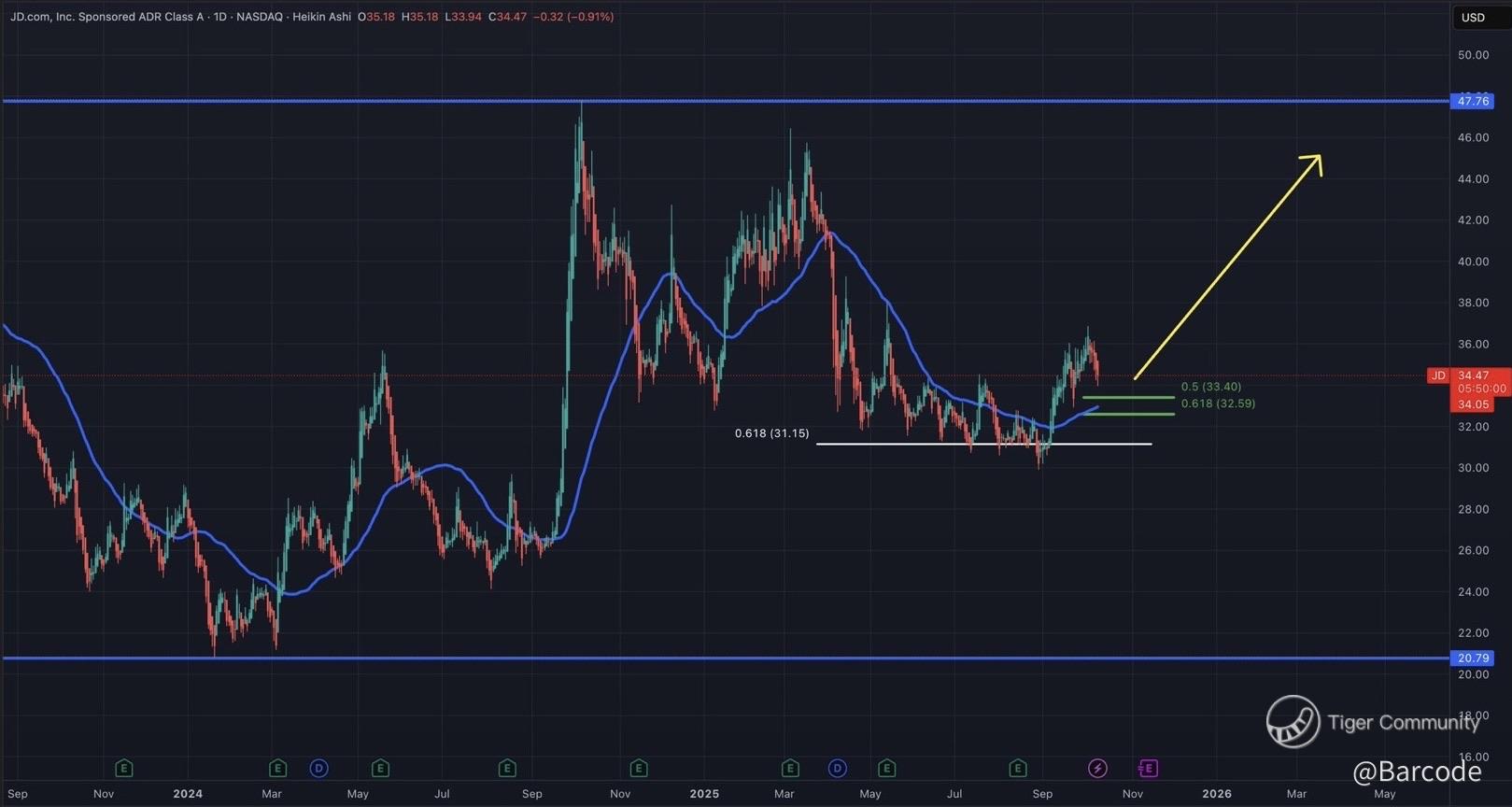 - PetSΒ·10-09TOPπ₯πThat $JD chart is textbook. 50-day MA right between 0.5 and 0.618, strong base, clean measured move. Itβs rare to see both macro breakout and technical setup line up this neatly. It really does look like a βwhen support holds, you addβ scenario.2Report