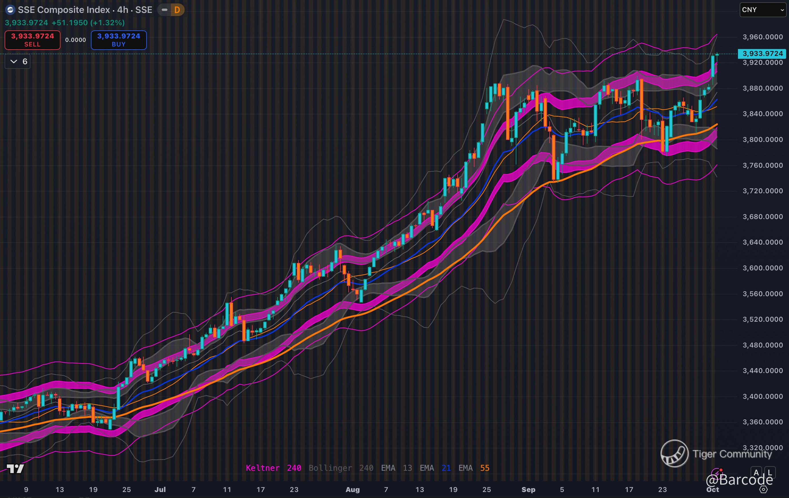 π 4H SSE Composite (000001): Volatility compression resolving to the upside with a clean Keltner/Bollinger breakout. Trend structure remains intact with EMAs stacked bullishly.