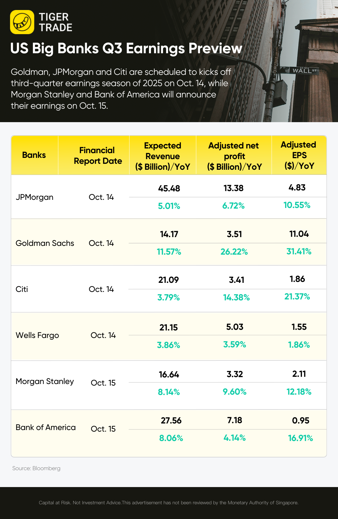 Six giants— $JPMorgan Chase(JPM)$ , $Citigroup(C)$ , $Wells Fargo(WFC)$ , $Goldman Sachs(GS)$ , $Morgan Stanley(MS)$ , and $Bank of America(BAC)$ —are set to report their Q3 results this week. Amid rising market volatility and trade tensions, all eyes are on whether these banks can deliver strong enough earnings to keep the rally alive.